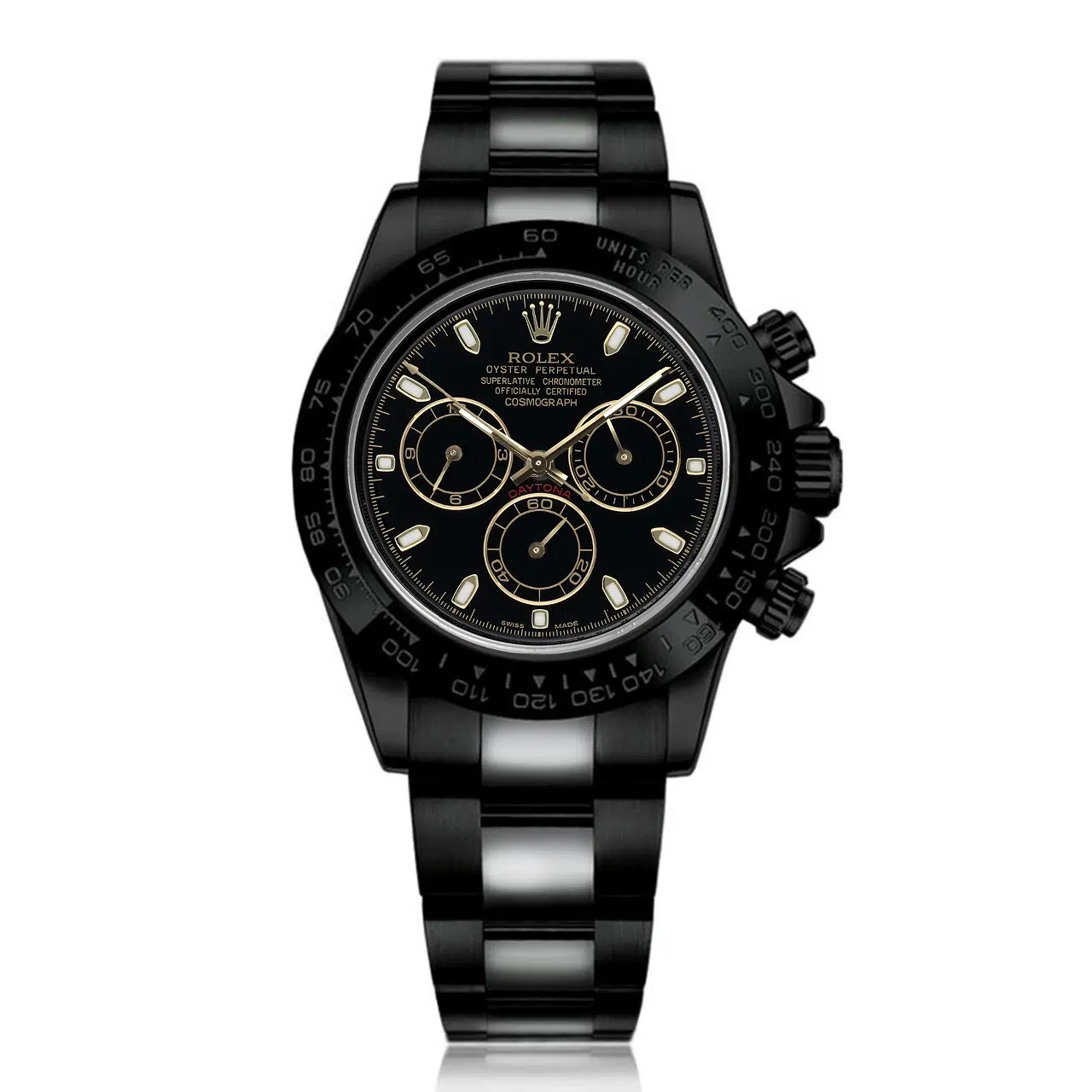 Powered by Rolex’s in‑house Calibre 4130 automatic chronograph, the 116523 was originally crafted in Oystersteel and 18k yellow gold and fitted to the robust Oyster bracelet with Oysterlock clasp—here finished to match the blacked‑out aesthetic. Water resistant to 100 m and built for precision timing, this customized Daytona delivers classic performance with modern attitude. Note: the black PVD/DLC finish is an aftermarket customization and not affiliated with Rolex.
