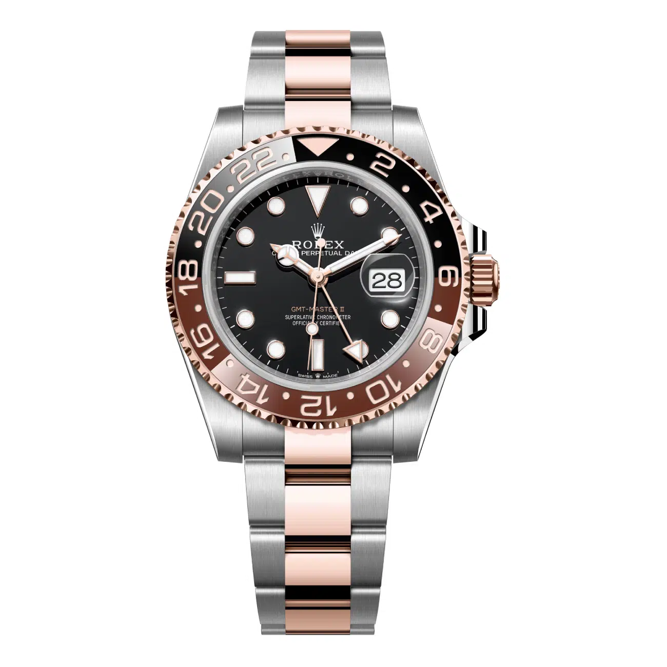 The Rolex GMT-Master II, reference 126711CHNR-0002, rose gold and stainless steel case. Powered by an automatic movement, 40 mm case and features a bidirectional rotating ceramic bezel and scratch resistant sapphire crystal.