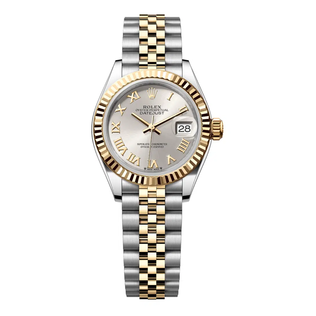 This elegant Rolex Datejust features a 28mm Yellow Rolesor case crafted from a combination of 904L stainless steel and 18K yellow gold. It showcases a silver dial with Roman numerals, protected by a scratch-resistant sapphire crystal with a Cyclops lens and double anti-reflective coating. The fluted bezel and Twinlock screw-down crown enhance its durability and classic style.
