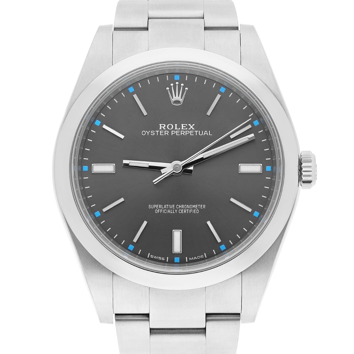 The beautiful dark rhodium dial on this new generation Oyster Perpetual is punctuated by luminous batons at 3,6 & 9. The larger 39mm case is framed by the polished steel smooth bezel, which contrasts beautifully with the brushed shoulders and links of the Oysterlock bracelet. Automatic with 48hr power-reserve, sturdy and understated, this is the perfect Rolex for every occasion. Waterproof to 100m.