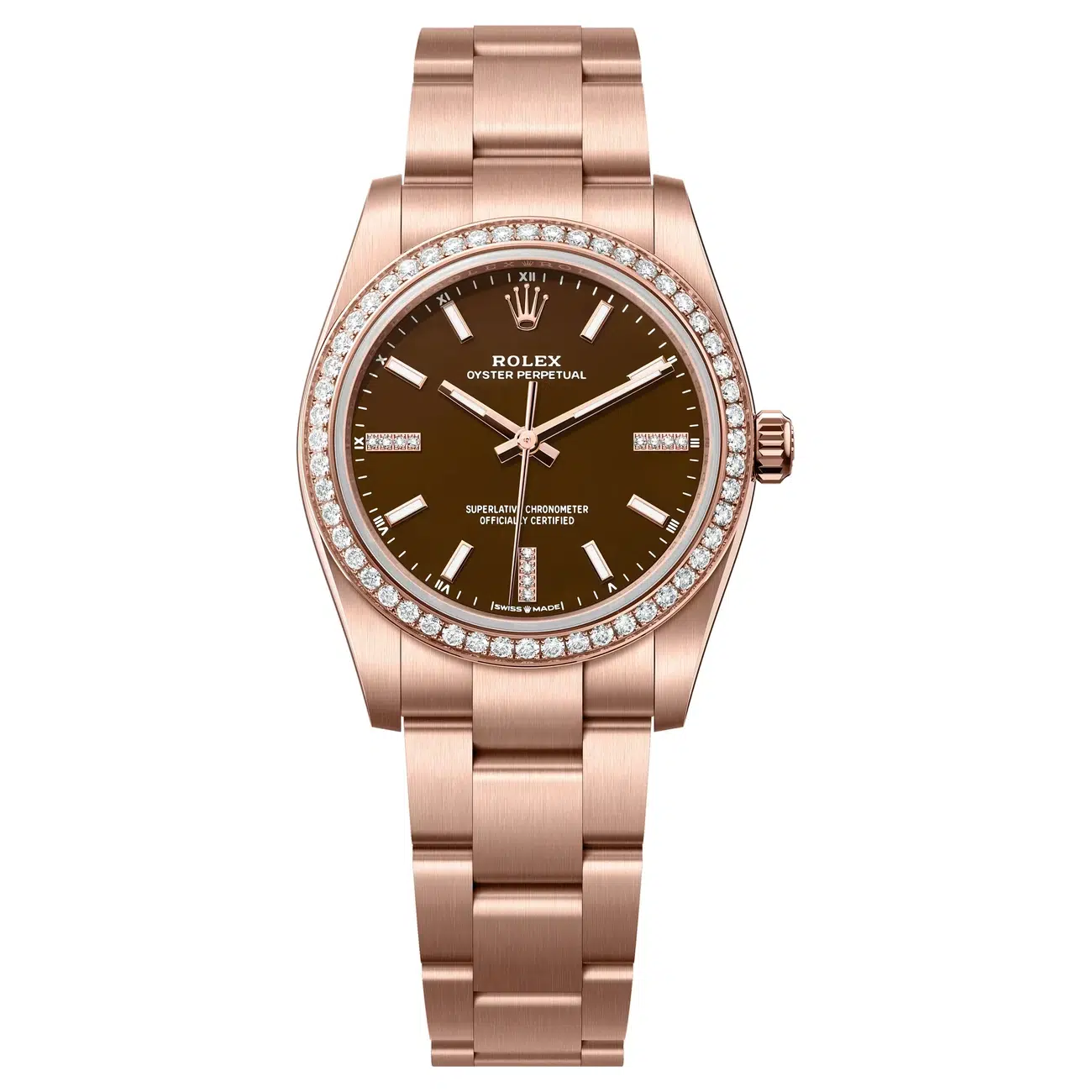 The Rolex Oyster Perpetual 124245RBR-0001 34mm 18kt Rose gold case, screw-down crown with twinlock double waterproofness system, domed bezel, scratch-resistant sapphire crystal. Brown stone dial, index hour markers.
