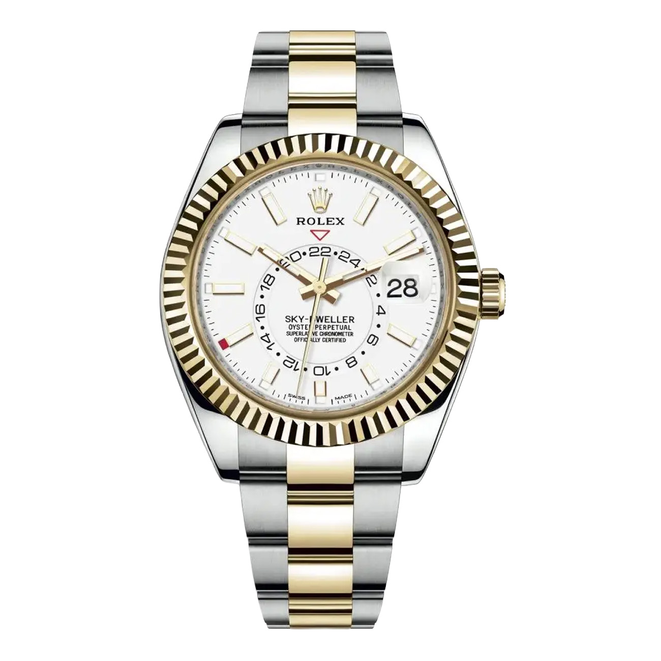 The Rolex Sky-Dweller reference 326933 42 mm, also known as the “Two-Tone Sky-Dweller. Crafted from durable gold and steel case with yellow gold fluted bezel. White dial with luminescent yellow gold-tone hands and luminescent index hour markers.