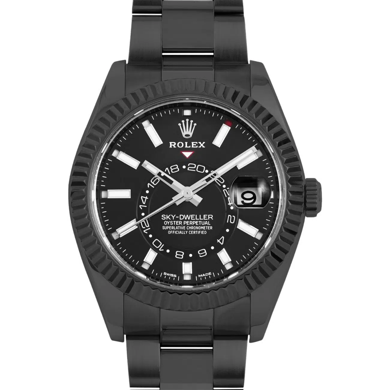 Introducing the exquisite Rolex Sky-Dweller 326934 with a captivating Black Dial and an elegant Oyster Bracelet, all enclosed within a robust 42mm case, featuring custom PVD/DLC coating. This unique timepiece is a symphony of style and durability, boasting a high-quality coating that ensures longevity and resistance to wear and tear.