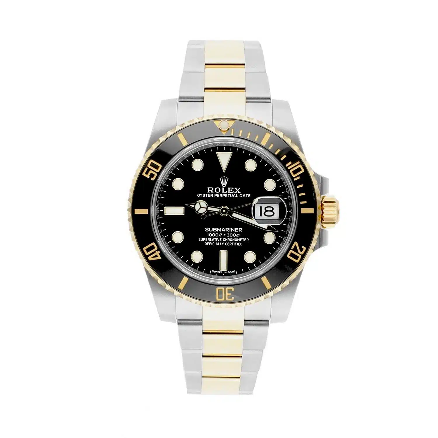 This Rolex Submariner Date 116613LN is in mint condition, professionally polished and serviced with no visible scratches or marks. It features a 40mm stainless steel case and Oyster bracelet with 18k yellow gold center links. The unidirectional bezel is made of 18k yellow gold with a black ceramic insert.