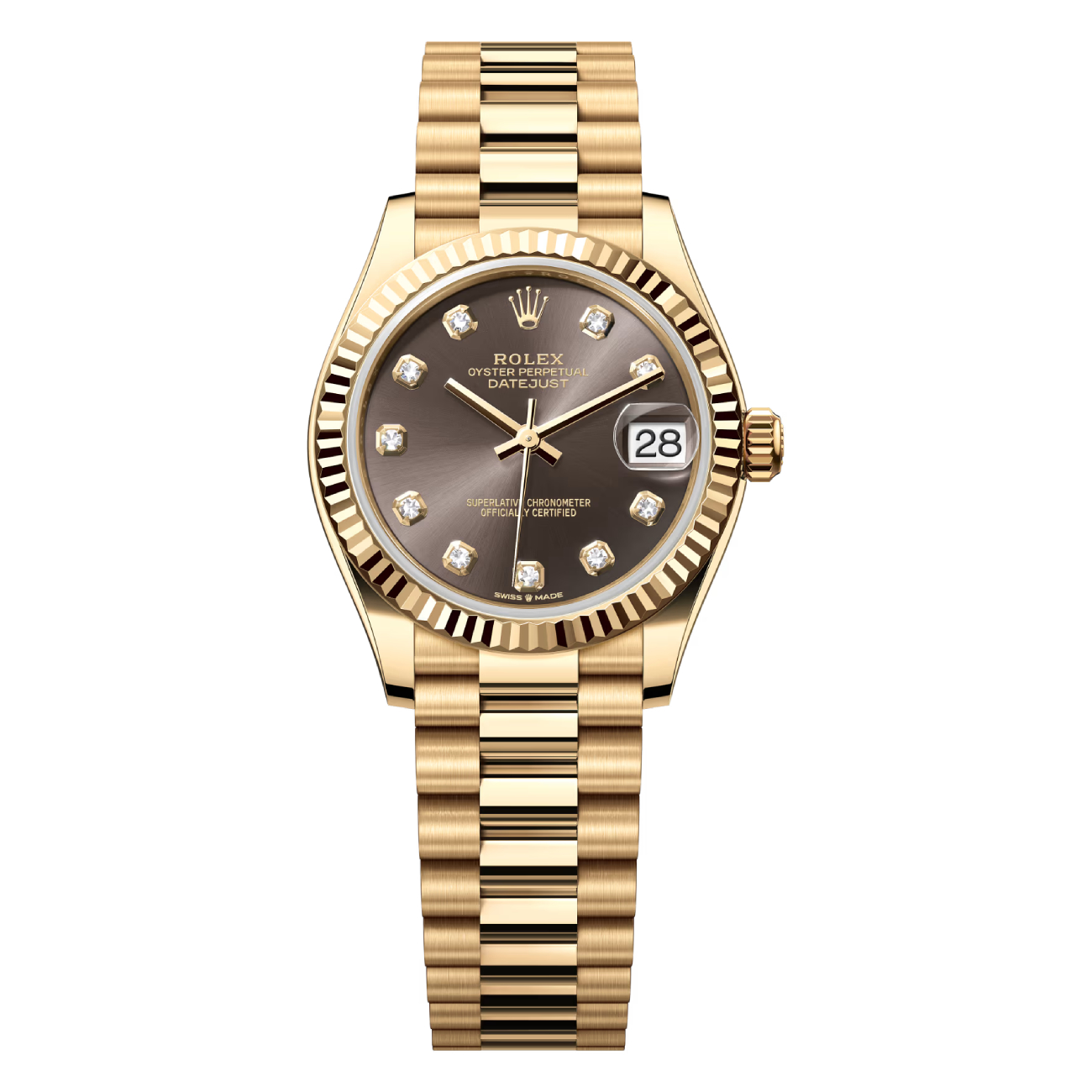 Rolex Yellow Gold Datejust 31 Watch Fluted Bezel 278278-0036 Grey Diamond Dial – President Bracelet