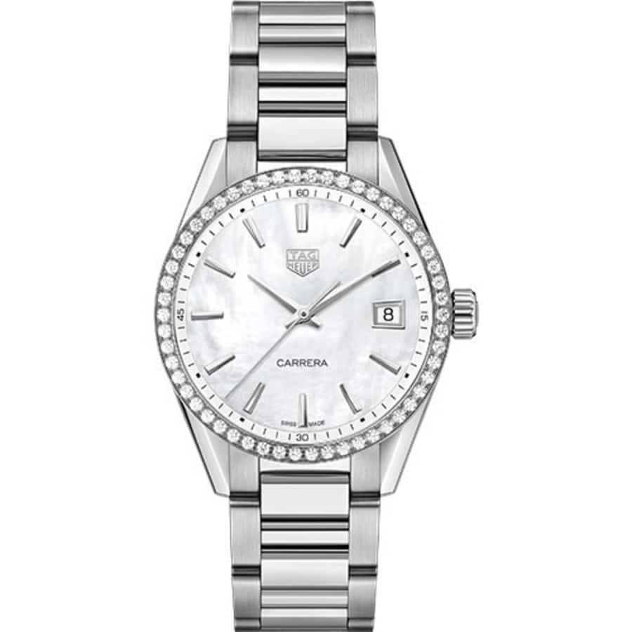 Tag Heuer Carrera Mother of Pearl Dial Diamond Stainless Steel Ladies Watch WBK1316.BA0652. Stainless steel case with a polished stainless steel bracelet. Fixed stainless steel set with diamonds bezel. Mother of pearl dial with silver-toned hands and index hour markers.