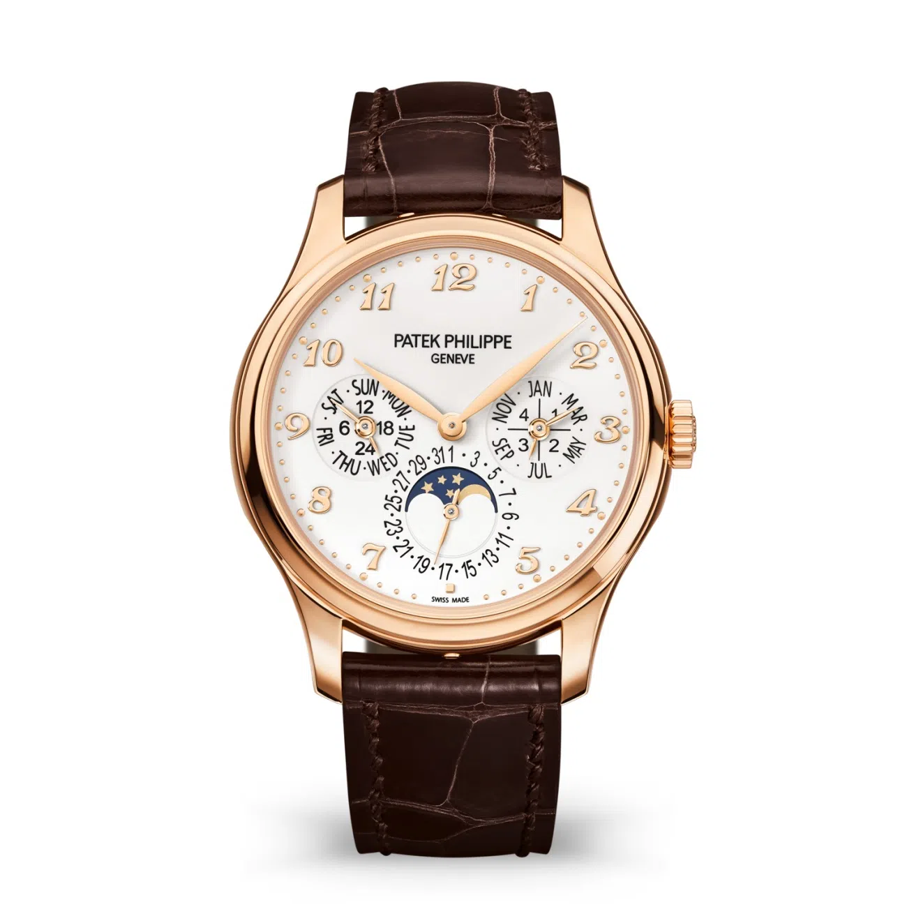 The Patek Philippe 5327R-001 Grand Complications is a refined rose gold timepiece featuring an ultra-thin self-winding movement with a perpetual calendar, moon phase, and 24-hour indication. Housed in a 39mm Calatrava case with elegant scalloped lugs, it boasts an ivory lacquered dial with gold applied Breguet numerals and a sapphire case back.